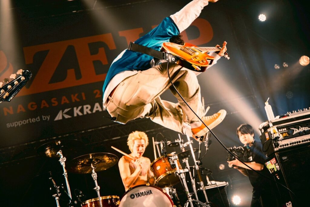 いつものようにテキーラで乾杯してから「行くぜ、長崎!」とダト・ダト・カイキ・カイキ(Ba/Vo)が気炎を上げ、重低音の速射砲が無限に放たれる「Will」をいきなりぶちかましていく。準備万端な観客も即座に呼応し、フロアは暴動状態。モッシュなのかダイブなのか、ちょっと不明瞭なほど混沌とした感じが実にいい。
