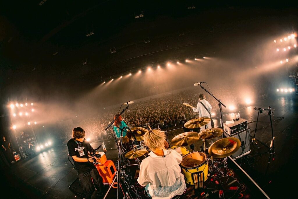 「こんにちは、Hump Backです、よろしく! 言っていいのかわからんけど・・・2年前に出る予定やったけど、産休でキャンセルして、SHANKにはめちゃくちゃ迷惑をかけました。おかげさまで、ウチら母ちゃんになって帰って来たぞー!」と林萌々子(Vo/G)はMCを入れ、ヒット曲「拝啓、少年よ」でショウはスタート。ピカ(B/Cho)、美咲(Dr/Cho)の強固なリズム隊の上で、林のハイトーン・ヴォーカルが映え渡る。それから「LILLY」、「ロケンロ」の2曲でさらに焚き付け、場の空気をHump Back色に染め上げる手腕はさすが。