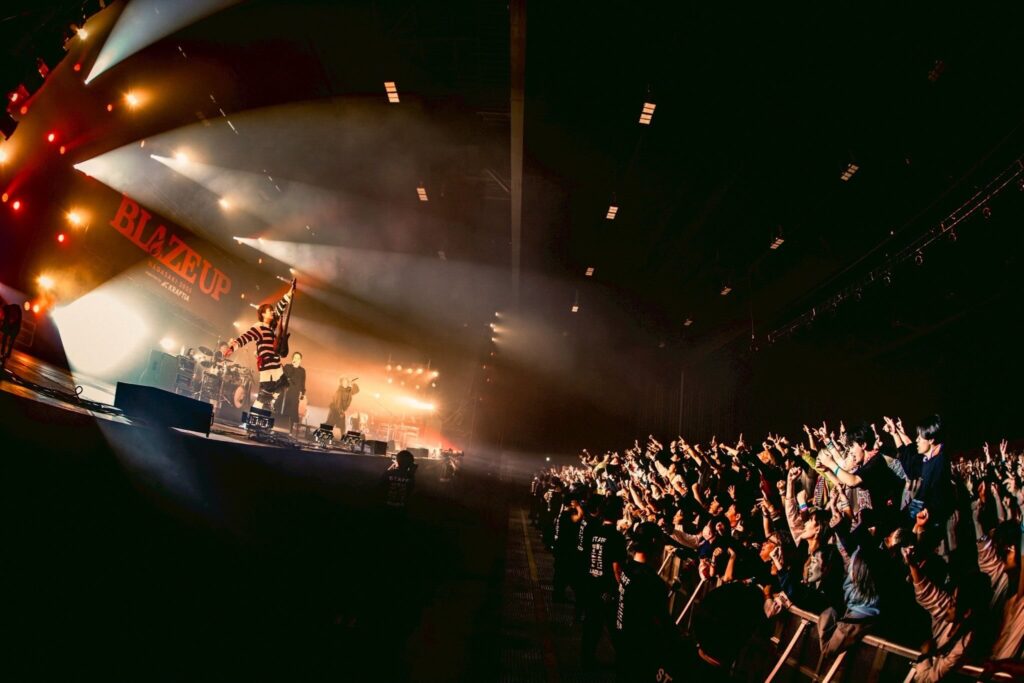 「ただいま、長崎! おかえり! 遠慮はいらねえ!」というN∀OKI(Vo)のニクい言葉から「世界の終わり」を轟かせ、1曲目からすべてを終わらせにきている勢いを生み出したのがROTTENGRAFFTYだ。やるぞ、という意気込みしか感じない戦慄のギターリフから始まり、鋭く放つNOBUYAの歌にヒリつきとザラつきがたまらないN∀OKIの歌が当然のことながらインパクト大。極悪な間奏では物理的に音で会場を揺らしていく。