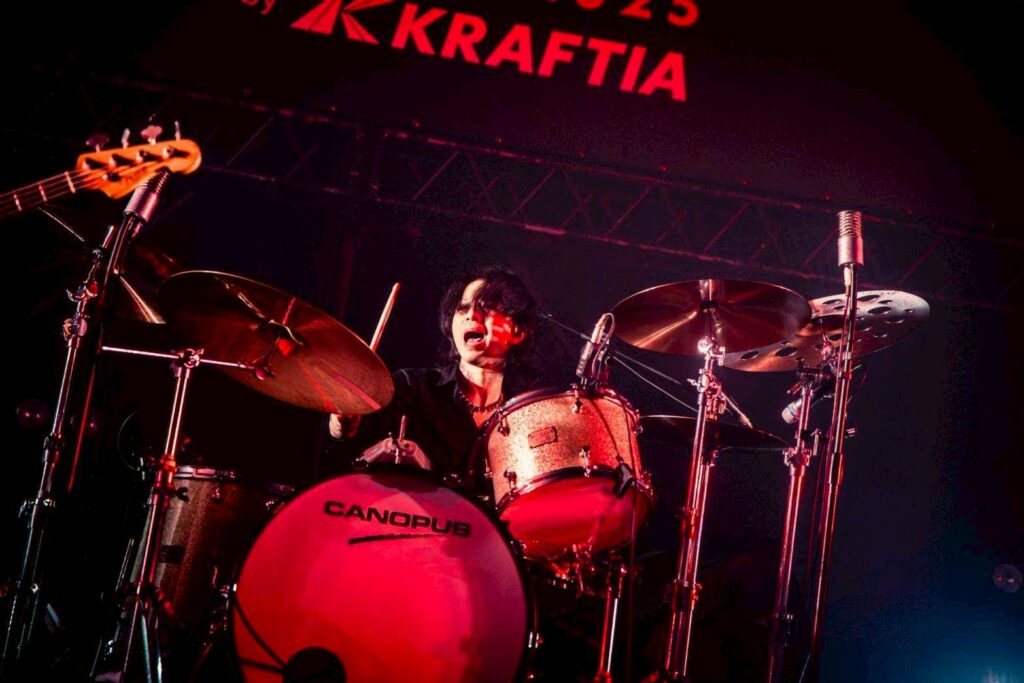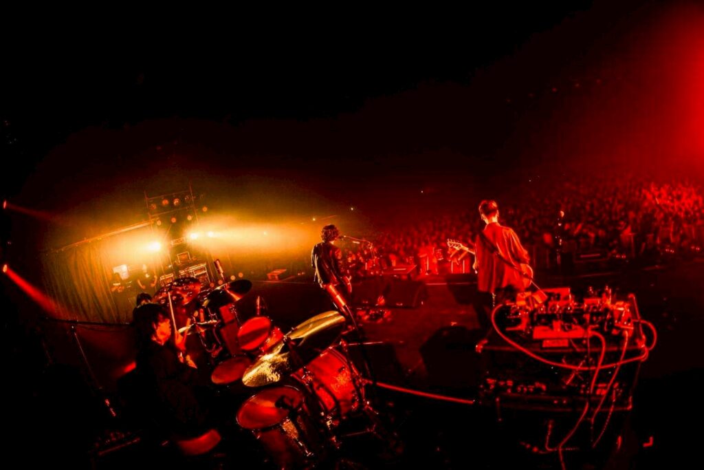 「大分のSIX LOUNGEです! SHANK、今年もありがとうございます! 俺らは俺らのいい歌を・・・この素晴らしい日を大いに楽しんでください!」と語り、「言葉にせずとも」へ。余計な装飾を省いたロックンロール、その直球の説得力に大勢の観客が骨抜きにされていった。それから今年10月に出た最新EP『燦燦』収録の「愛 don’t OK」をプレイ。これまであまりなかったタイプのリズミックな曲調だが、フロアのリアクションは好反応だ。ユウモリの裏声も出島メッセを突き抜け、大空に羽ばたくような高揚感をもたらしていた。ライヴも佳境に入り、「ナイトタイマー」、「スピード」と続き、シンタロウのドラムは激しさを増していく。フィジカルを揺さぶるビートに会場は過熱状態に陥る。