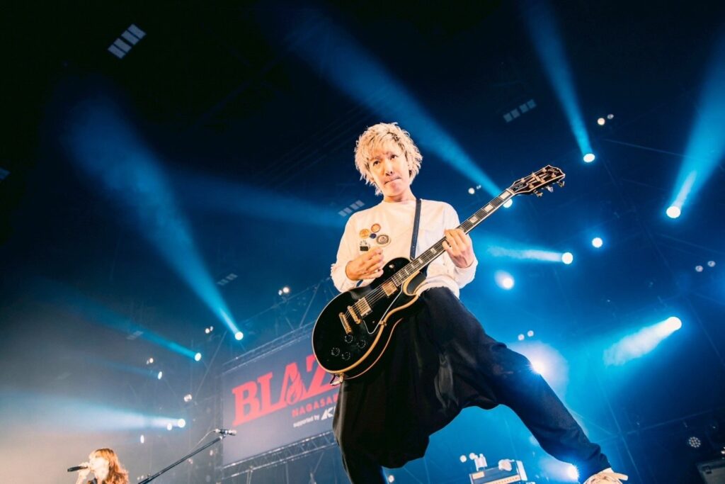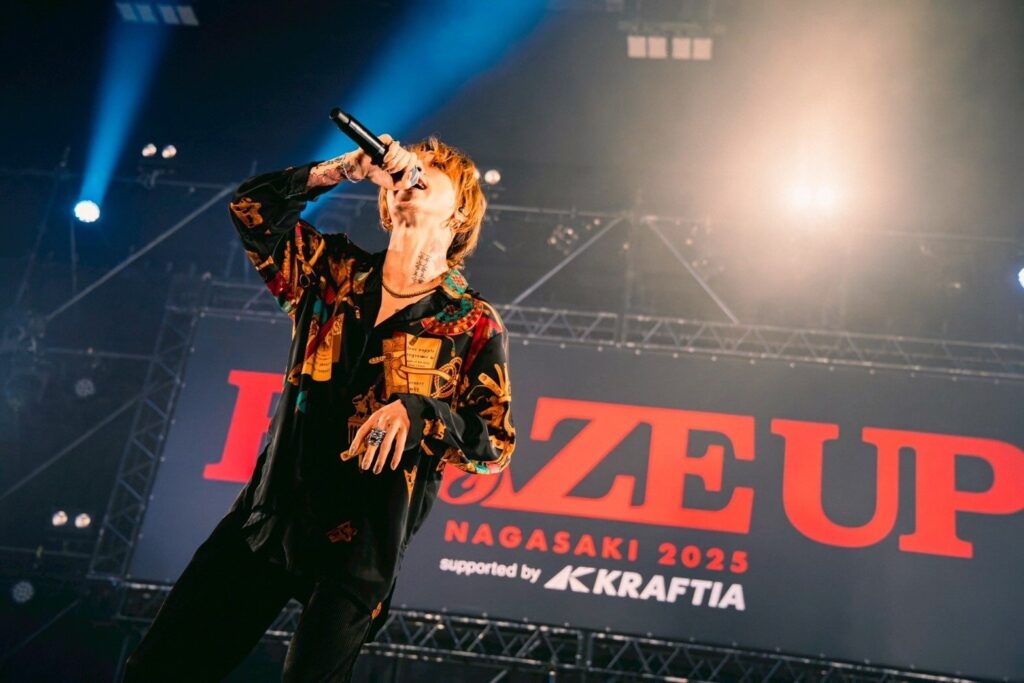 「いろんな同世代が志半ばで音楽をやめたり、他の道を進む中、自分たちにとって数少ない同世代、特にSHANKは同い年。そんなヤツらが地元を背負ってやってるカッコいいイベントがある、と。あなたがしっかり生きてきた軌跡みたいなモノをオレたちがこの1日で音楽にできたら最高だな、って思うからこそ、同士の意志に賛同してここに立たせてもらってるんだよ」と渋谷がSHANKと『BLAZE UP NAGASAKI』への想いを語ってから、愛や夢や希望、誰もビビって歌わないことをオレたちが、と、会場にいる全員で《愛してる》と心の底から叫んで最高潮で始めた「アイラヴユー」、全部を使い切るのが誠意だと伝え、より覚醒を促した「青い春」と続けるのだから、体中の血がたぎりまくった観客は枯らさんばかりに大声を張り上げていく。